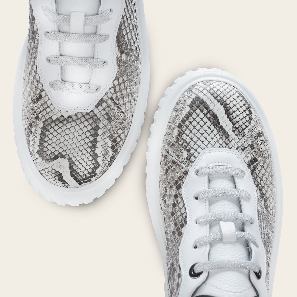 Tenis para dama en piel genuina de pitón y piel de bovino. Presenta aplicaciones de piel de bovino. Ajustados con agujetas.