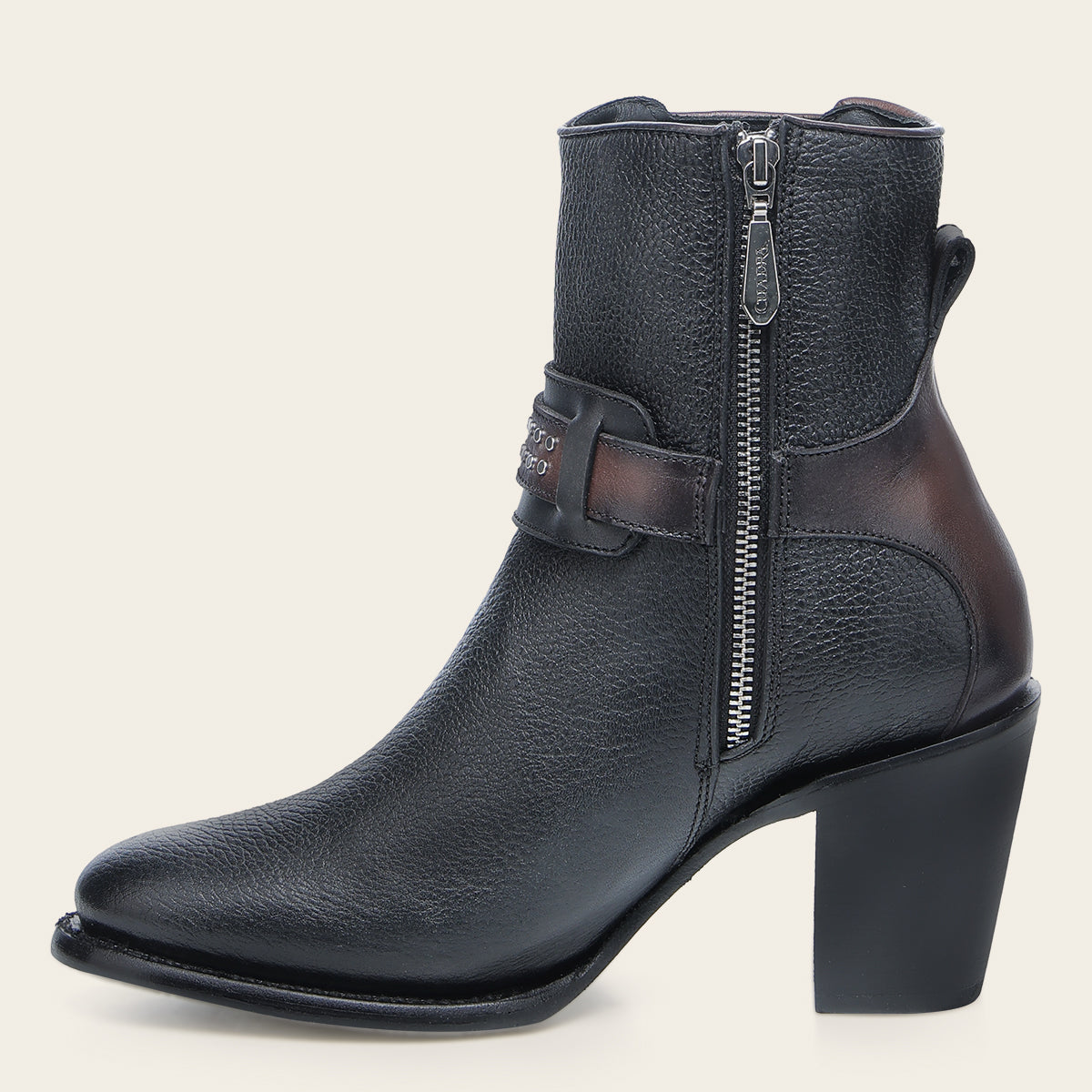 Botín biker para dama en piel genuina de bovino. Presenta correa decorativa alrededor del tobillo con herrajes y aplicación metálica en forma de herradura. En el costado presenta aplicación de estoperoles. Ajustada con cierre interno y aplicación elástica forrada en piel para mejor ajuste. Cuenta con las nuevas tecnologías: tubo con entretelas suaves, planta Ortholite y plantilla flex removible.