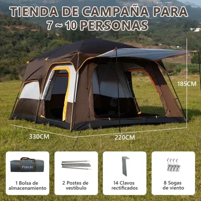 -La tienda es perfecta para acampar al aire libre de 7 a 10 personas, el tamaño es 330*220*200 cm -Cuatro particiones principales en la tienda crean espacio. Hay dos dormitorios dentro de la tienda. Si hay mucha gente, las cortinas divisorias se pueden quitar para ampliar el espacio interno. - Hecho de tela Oxford 210D resistente al desgarro y tela de PE resistente al desgaste engrosada hidráulicamente de 3000 mm. -Tubo de hierro pintado + material de marco de poste de fibra, con un rendimiento duradero -Con la tienda se incluyen dos postes de entrada. Utilice los postes del pasillo y las cuerdas resistentes al viento para sostener la cortina de la tienda y transformarla en un pasillo exterior natural. -Hay ventanas superiores transpirables, ventanas laterales y dos ventanas traseras con un total de 5 aberturas, que pueden permitir la entrada de brisa y evitar la entrada de insectos.