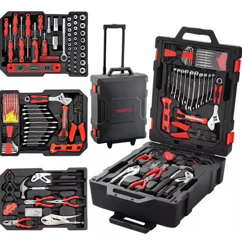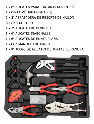 Este kit incluye: 7 x DESTORNILLADOR (SL6*100; PH2*100; SL3*75; SL5*75; PH1*75; SL6*38; PH2*38) 1 x MANGO DE DESTORNILLADOR MULTIFUNCIONAL 1 x NIVEL DE TORPEDO 20 x 25MM PUNTAS DE DESTORNILLADOR (PH1-2,S0-1-2-3,H1/8-5/32-3/16-1/4,SL1/8-5/32-3/16-1/4,T10-15-20-25-30,AD) 1 x 3/8 PULGADA LLAVE CRIQUE 1 x BARRA DE EXTENSIÓN (3/8*3pulgada) 2 x SPARK PLUG SOCKET (3/8*16mm&21mm) 12 x 1/4 PULGADA LLAVES DE VASO (4-4.5-5-5.5-6-7-8-9-10-11-12-13mm) 12 x 1/4 PULGADA LLAVES DE VASO (5/32-3/16-7/32-1/4-9/32-5/16-11/32-3/8-13/32-7/16-15/32-1/2) 4 x 3/8 PULGADA LLAVES DE VASO (14-15-17-19mm) 4 x 3/8 PULGADA LLAVES DE VASO (9/16-5/8-11/16-3/4) 1 x 8 PULGADA ALICATES PELACABLES 1 x MINI SIERRA DE MANO 1 x CUCHILLO DE UTILIDAD (18mm) 1 x 8 PULGADA LLAVE AJUSTABLE 5 x LLAVE COMBINADA (10-12-13-14-15mm) 5 x LLAVE COMBINADA (3/8-7/16-1/2-9/16-5/8) 6 x DESTORNILLADOR DE PRECISIÓN 8 x JUEGO DE LLAVES ALLEN MÉTRICAS (1.5-2-2.5-3-4-5-5.5-6mm) 8 x JUEGO DE LLAVES ALLEN MÉTRICAS (1/16-5/64-3/32-1/8-5/32-3/16-7/32-1/4) 1 x 6 PULGADA ALICATES PARA JUNTAS DESLIZANTES 1 x CINTA MÉTRICA (3Mx10FT) 2 x 3 PULGADA ABRAZADERA DE RESORTE DE NAILON 80 x KIT 1 x 7 PULGADA ALICATES DE BLOQUEO 1 x 6 PULGADA ALICATES DIAGONALES 1 x 6 PULGADA ALICATES DE PUNTA PLANA 1 x 8OZ MARTILLO DE GARRA 1 x 9 PULGADA JUEGO DE ALICATES DE JUNTAS DE RANURA 1 x CAJA DE HERRAMIENTAS
