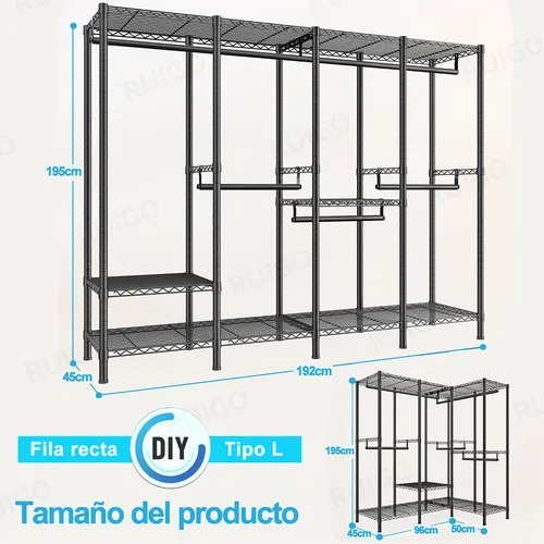 El perchero metálico Perchero mide 195 cm (largo) x 192 cm (ancho) x 45 cm (alto). Fabricado en metal ferroso de alta resistencia, tiene una capacidad total de aproximadamente 520 kg (1150 lb), lo que le permite colgar más de 260 vestidos de verano. La parte superior del perchero metálico también permite guardar maletas, cajas de almacenamiento y ropa doblada. Si buscas un armario organizador ideal, ¡el Perchero Ropa es el regalo perfecto!