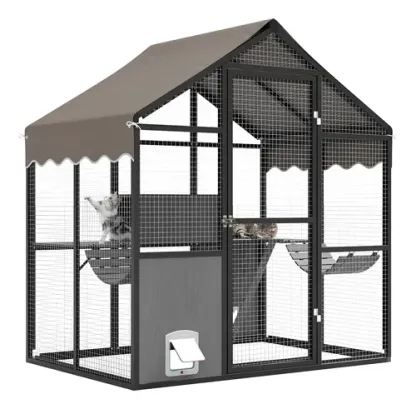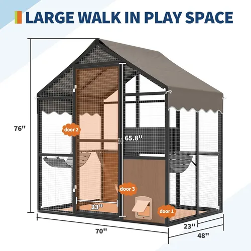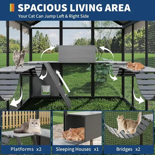 3.Amplio espacio de actividad: este gran recinto para gatos al aire libre proporciona una vasta área para que varios gatos jueguen, descansen y descansen. Mide 177.8 cm de largo, 122 cm de ancho y 194 cm de altura, ofrece mucho espacio. Los propietarios pueden unirse a sus mascotas o simplemente relajarse y ver a los gatos divertirse en su nuevo lugar favorito.