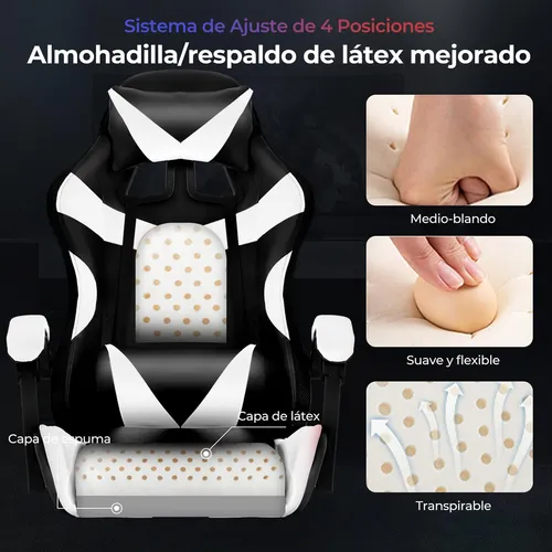 Silla Gaming Ergonómica Incluye una almohada en la parte superior para proteger el cuello y evitar molestias. El respaldo es más amplio para acomodar los hombros, lo que permite mayor comodidad al apoyarse. También incluye un masajeador lumbar adicional que vibra para aliviar la fatiga. Los apoyabrazos ajustables facilitan la máxima relajación y tienen almohadillas de esponja que ofrecen suavidad al apoyar.